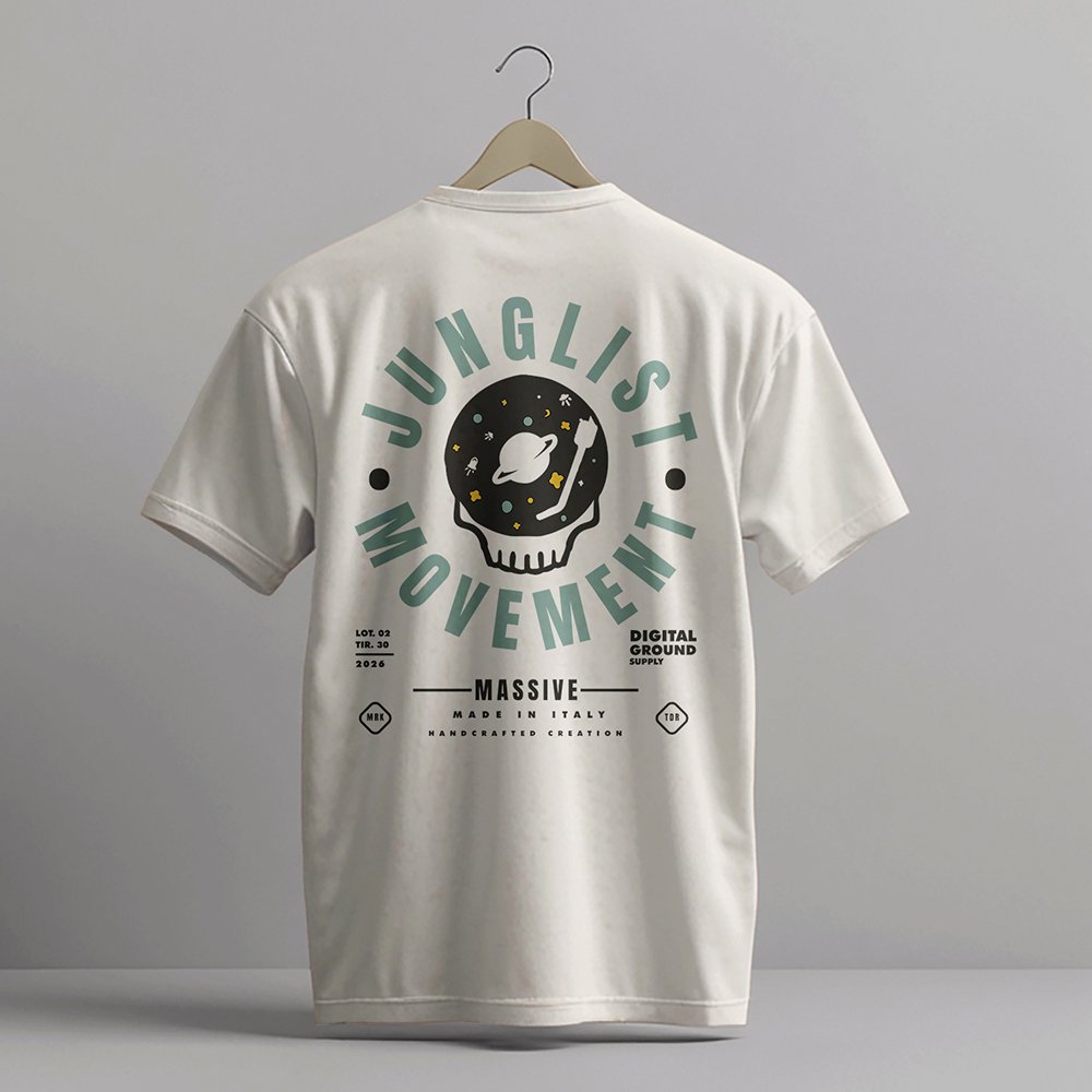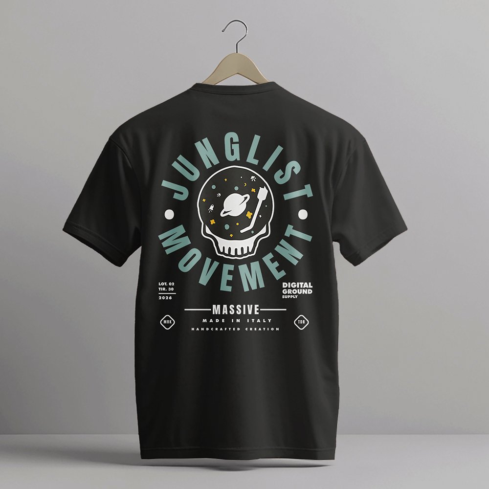 Junglist Movement รจ una t-shirt che celebra lโ€™energia della cultura street e della musica underground attraverso un design deciso e contemporaneo. La grafica posteriore raffigura un teschio reinterpretato in chiave urban, arricchito da elementi cosmici e simbolici che richiamano movimento, libertร  ed espressione personale.